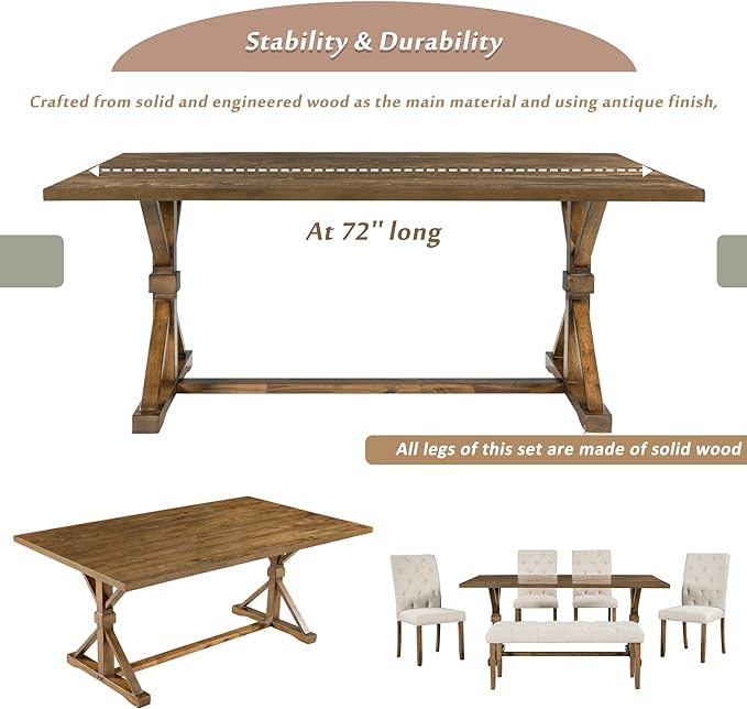 Room 6-Piece Farmhouse Dining, Solid Kitchen Set-includes 72 Inches Wood Rectangular Table, 4 Upholstered Chairs, and Bench, Ideal for Family Gatherings, Walnut, 1