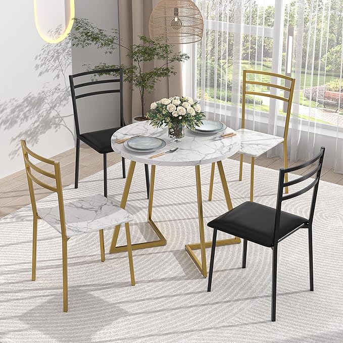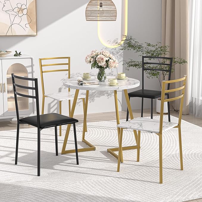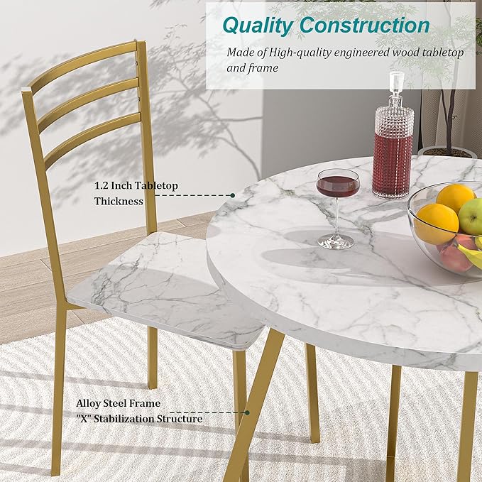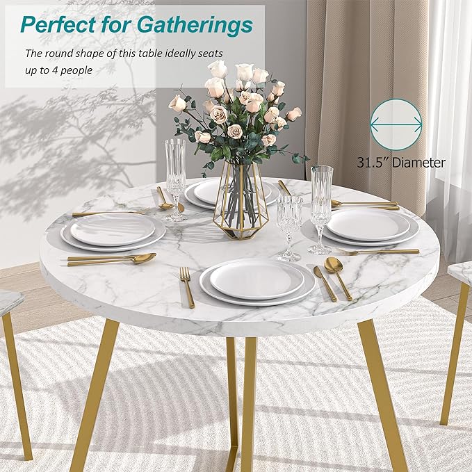 VECELO Round Dining Table with Steel Frame for 2-4 People, Space Saving for Home, Kitchen, Apartment, White & Gold