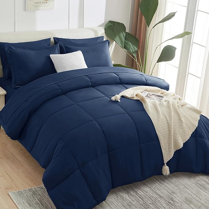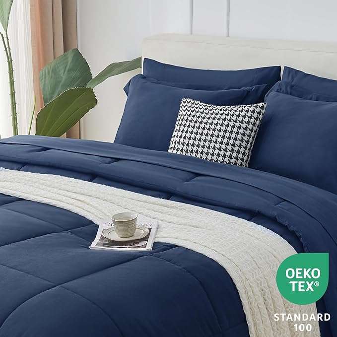 CozyLux Queen Comforter Set - 7 Pieces Bed in a Bag Set Navy Blue Queen, Complete Bedding Sets Bed Set for All Season with Comforter, Flat Sheets, Fitted Sheet, Pillowcases & Shams