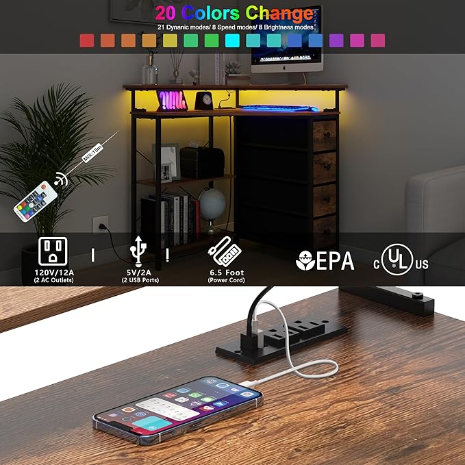 Corner Desk with Drawers Shelves for Small Space 90 Degrees Triangle Computer Desk with Power Outlets,Gaming Desk with LED Lights Monitor Stand for Home Office Workstation Writing Table (Brown)