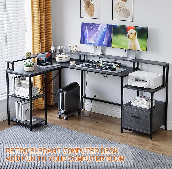 About This Extensive Storage Options: This L-shaped desk features a file drawer, printer cabinet, 2-tier under-bookshelf, and a computer tower...