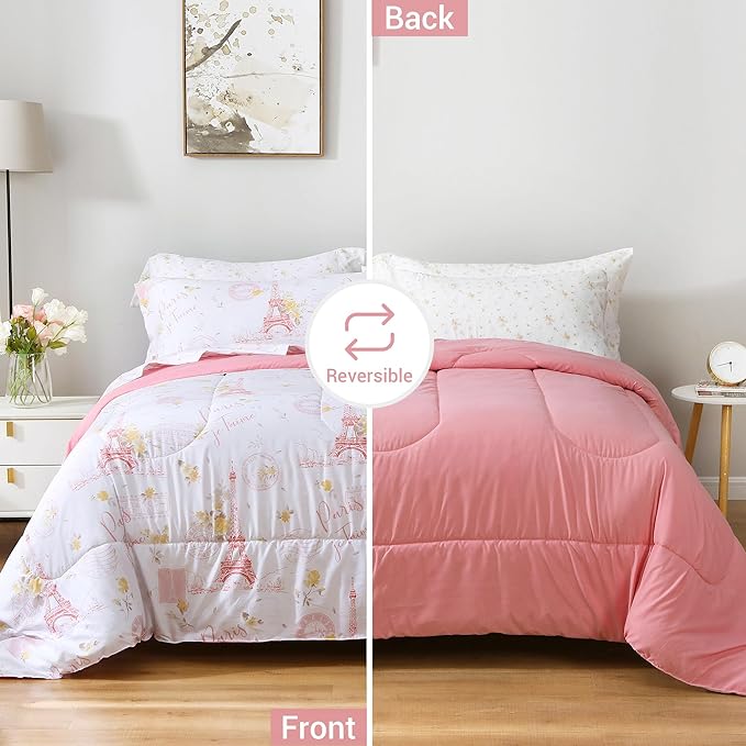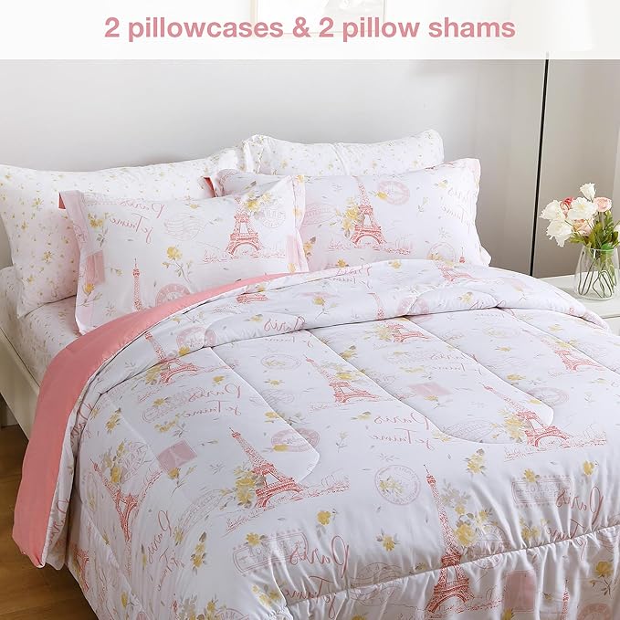 Printed Queen Bedding Sets with Comforter and Sheets, 7 Piece Bed in A Bag Comforter Set with Fluffy Microfiber, Romantic Paris City Floral Pink Retro Eiffel Tower Pattern