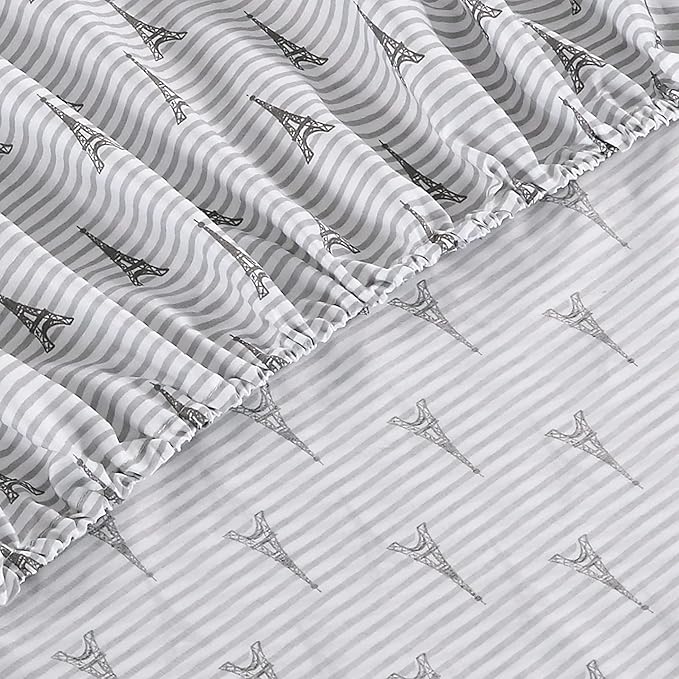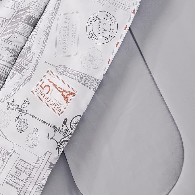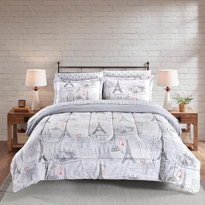 Printed King Bedding Sets with Comforter and Sheets, 7 Piece Bed in A Bag Comforter Set with Fluffy Microfiber, Vintage French Paris City Retro Eiffel Tower Pattern