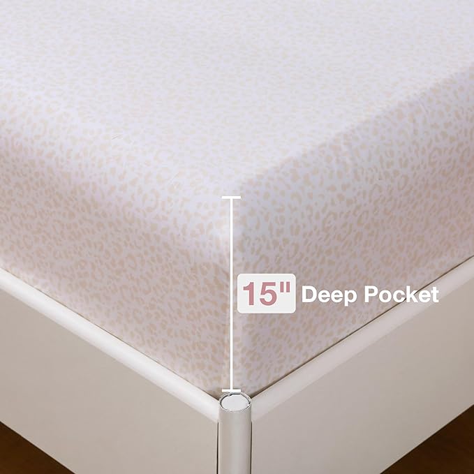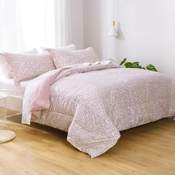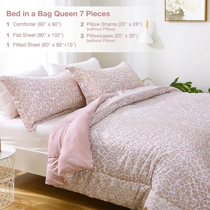 Printed Queen Bedding Sets with Comforter and Sheets, 7 Piece Bed in A Bag Comforter Set with Fluffy Microfiber, Stylish Pink Leopard Pattern