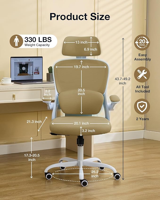 Ergonomic Office Chair with Tilt-Lock, Home Office Desk Chair with Auto Lumbar Support, High Back Mesh Desk Chair with Adjustable Headrest, Swivel Task Chair or Study Room Bedroom,Light Brown