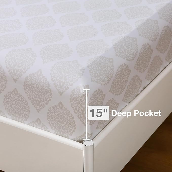 Printed Queen Bedding Sets with Comforter and Sheets, 7 Piece Bed in A Bag Comforter Set with Fluffy Microfiber, Light Gold Leaf Floral Pattern