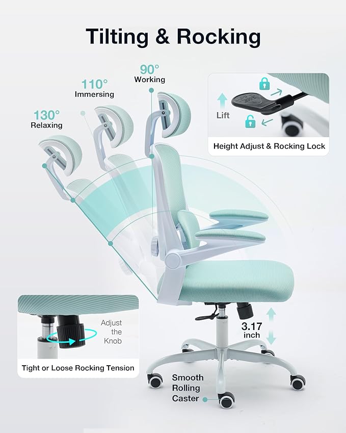 Ergonomic Office Chair with Tilt-Lock, Home Office Desk Chair with Auto Lumbar Support, High Back Mesh Desk Chair with Adjustable Headrest, Swivel Task Chair or Study Room Bedroom,Lake Blue