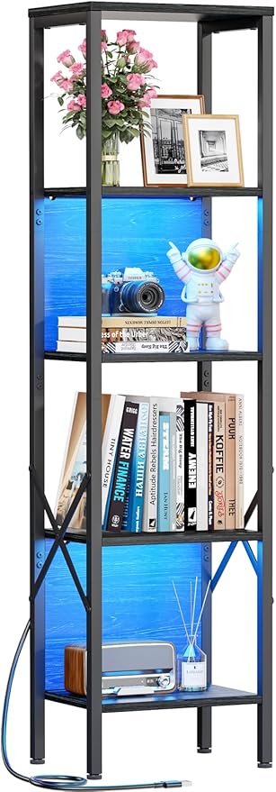 Furologee 5 Tier Book Shelf with LED Light, Tall Display Bookcase with Back, Narrow Industrial Standing Shelving Units, Metal and Wooden Storage Rack for Bedroom, Living Room, Office, Black Oak