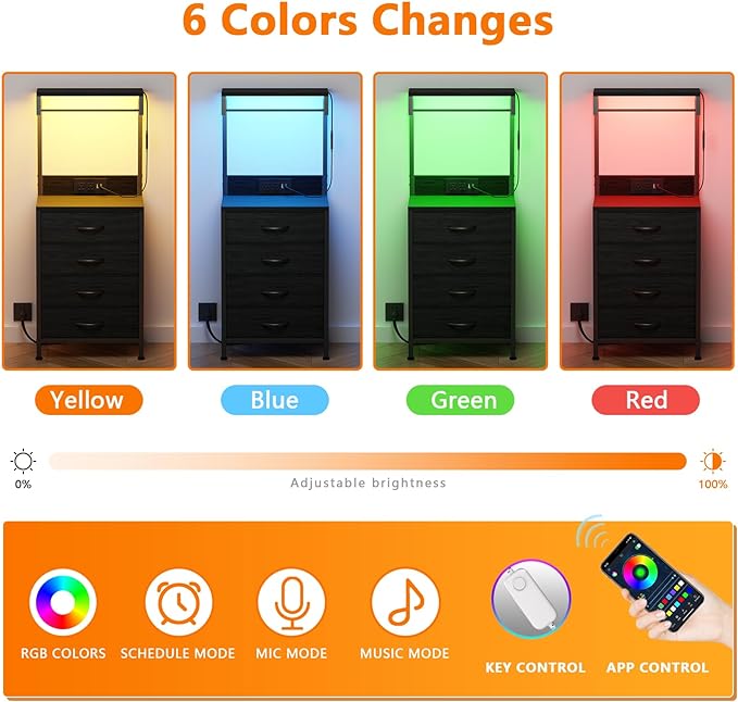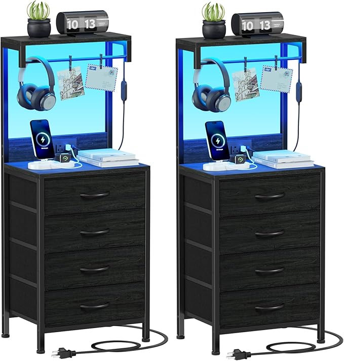 Furnulem Tall Nightstands Set of 2, Night Stand with 4 Drawers and shelves, Tall Bedside Table with USB Port Charging and LED Lights, Side Table for Bedroom, Office, Dorm (Black Oak)