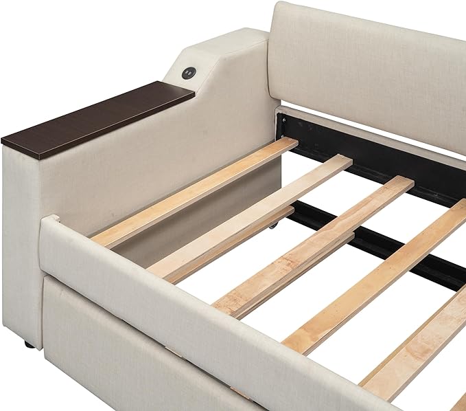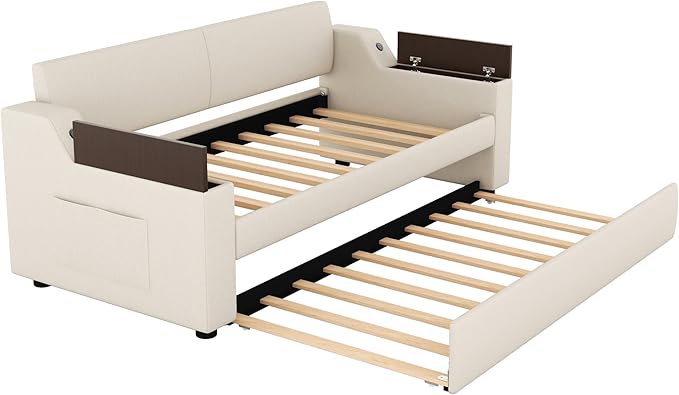Twin Size Upholstery Daybed with Storage Arms, Trundle and USB Design, Sofa Bed Day Bed for Bedroom Living Room Guestroom, No Box Spring Needed, Beige