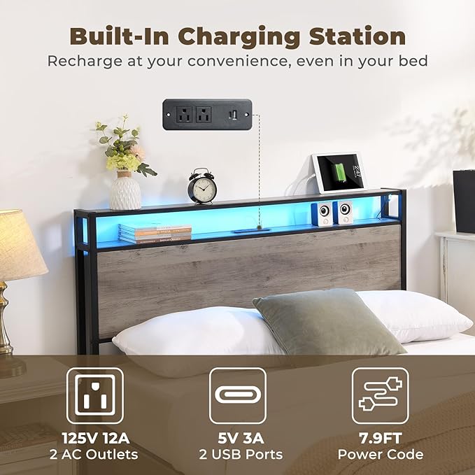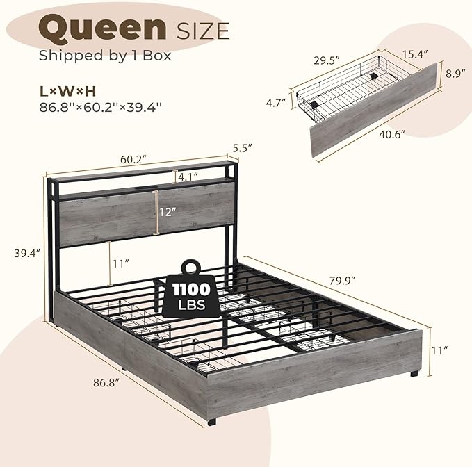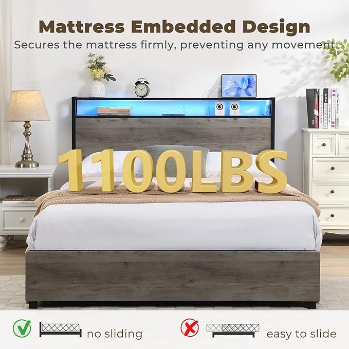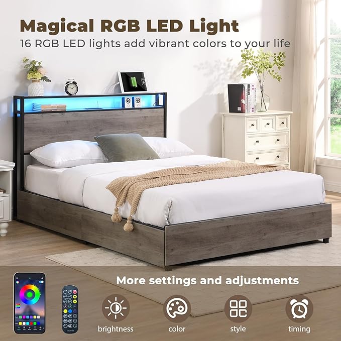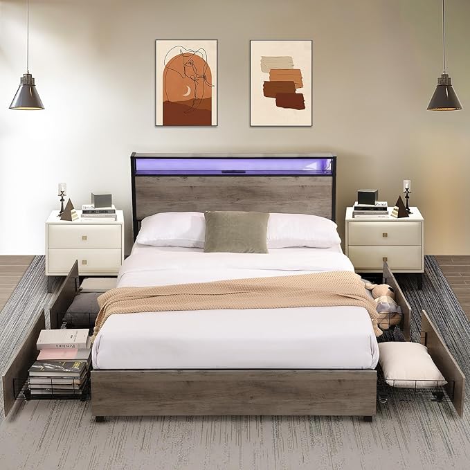 LED Queen Bed Frame with 4 Storage Drawers & Charging Station, Platform Metal Bed Frame with Headboard, Noise-Free, No Box Spring Needed, Ancient Gray