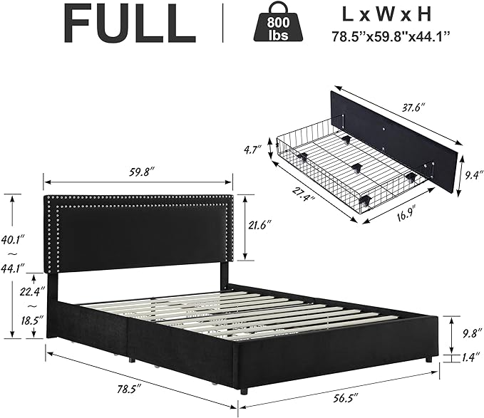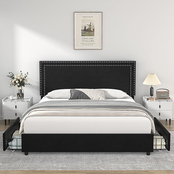 VECELO Full Size Upholstered Platform Bed Frame with 4 Storage Drawers, Adjustable Velvet Rivets Headboard, Wooden Slats Support, No Box Spring Needed, Easy Assembly