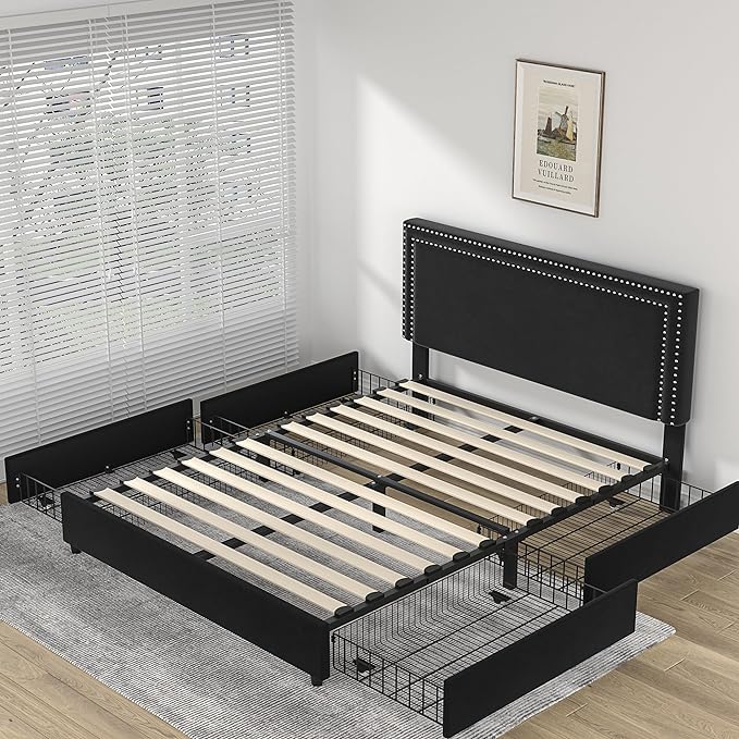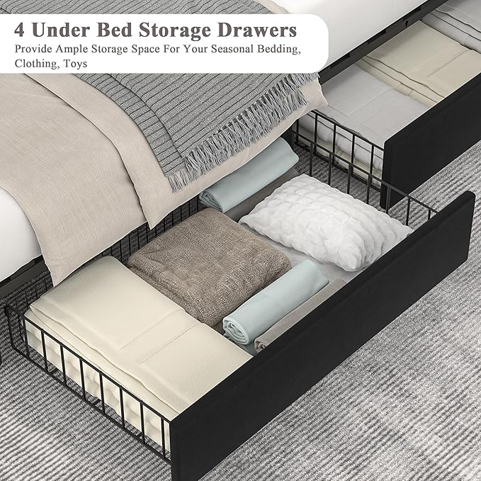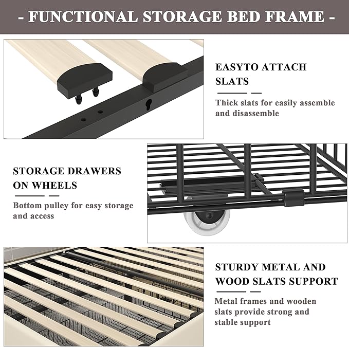 About This Wood & Metal [Bed Frame with 4 Storage Drawers]--The bed frame with 4 storage drawers features easy-to-use wheels...