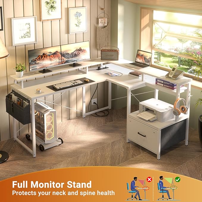 Unikito L Shaped Desk with File Drawer, Reversible L Shaped Computer Desk with Power Outlet & LED Lights, Home Office Desk Corner Desk with Monitor Shelf and Printer Cabinet, Gaming Desk, White