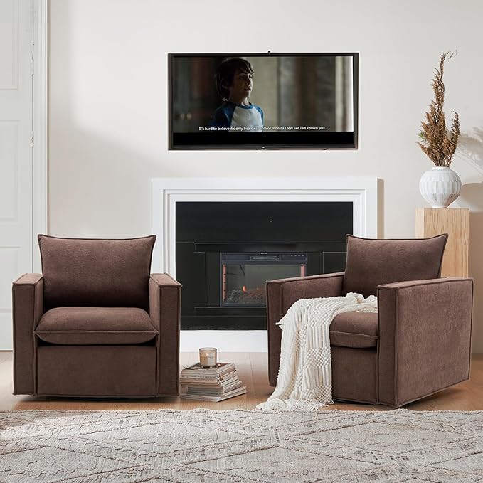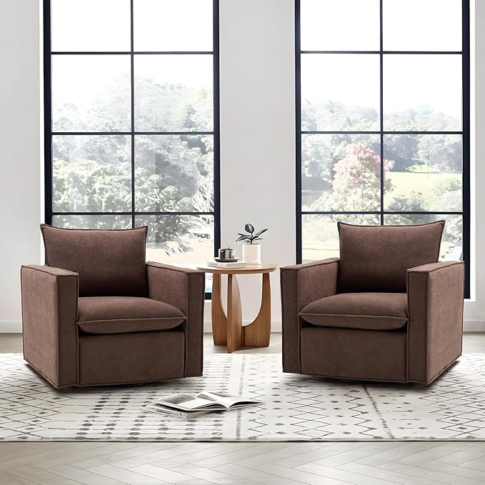 COLAMY Swivel Accent Chair Set of 2, 34inches Wide Upholstered Arm Chair with Plump Back Pillow, Modern Sofa Living Room Chair for Bedroom, Corner, Reading Nook-Brown