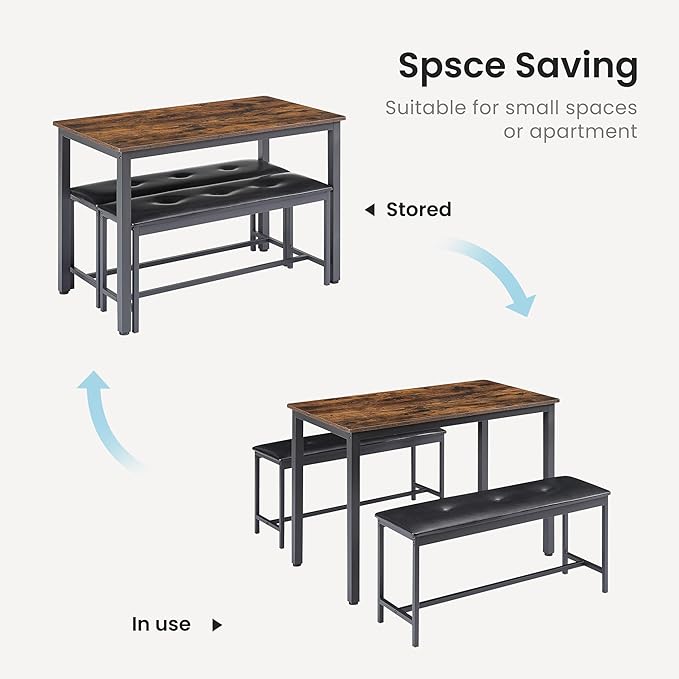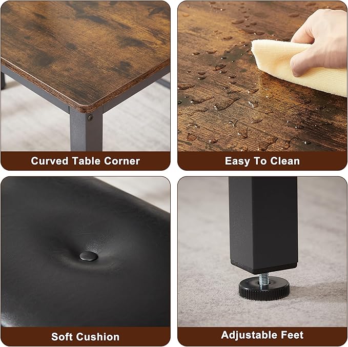 4 Person, 43.3in Kitchen Table 2 Upholstered Benches for 4-6, Nesting Furniture Set for Dining Room Restaurant Small Spaces Pub Bar Bistro Dinette, Rustic Brown-pu