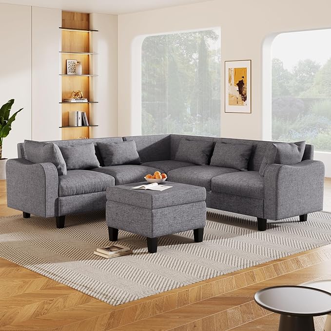 Modern L-Shaped Couch with Coffee Table & 6 Pillows, 6-Seat Sectional Sofa Set with Storage Ottoman & Unique Curved Armrest, Convertible 5-Seat Indoor Furniture for Living Room, Apartment