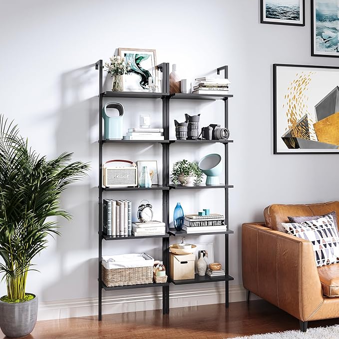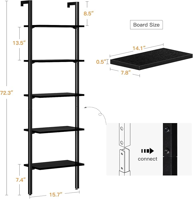 ODK Ladder Shelf, 5 Tier Black Bookshelf, 72 Inch Wall Mounted Book Shelf with Metal Frame, Ladder Bookshelf Bookcase for Bedroom, Home Office and Living Room