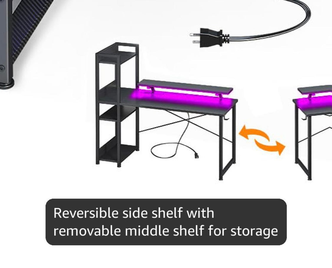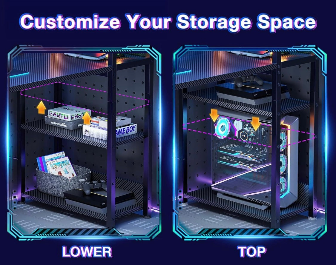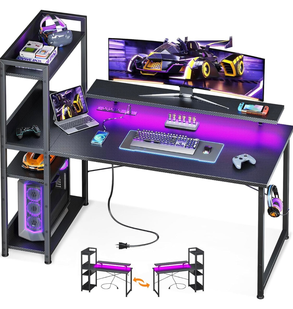 Gaming Desk with Power Outlets & Music Strip Lights,47In Reversible Computer Desk with Storages Shelves,Wooden Drawer& CPU Stand, PC Laptop Table with Large Monitor Stand for Home Office