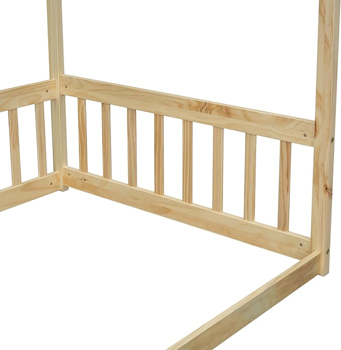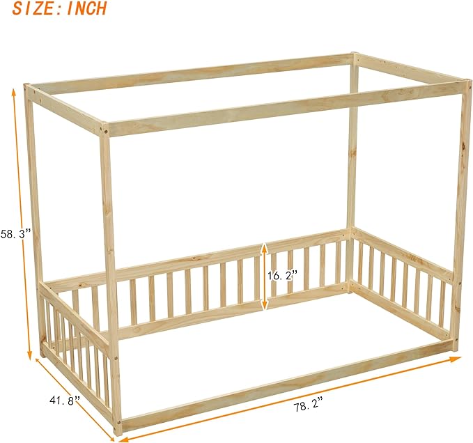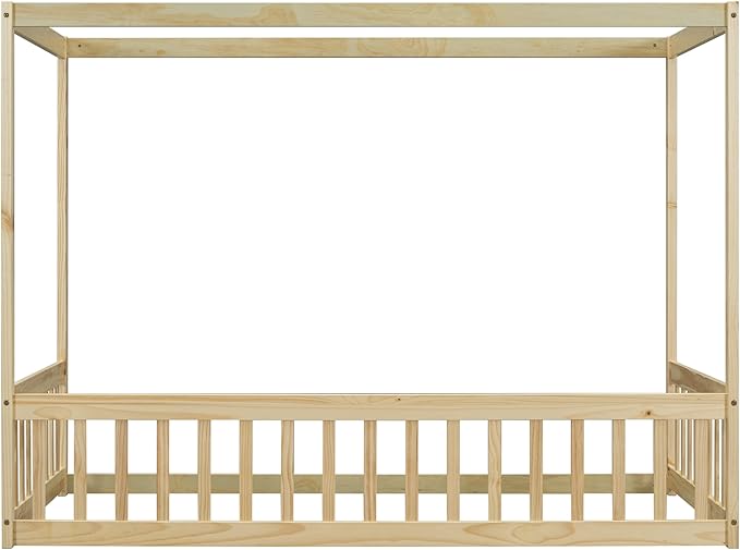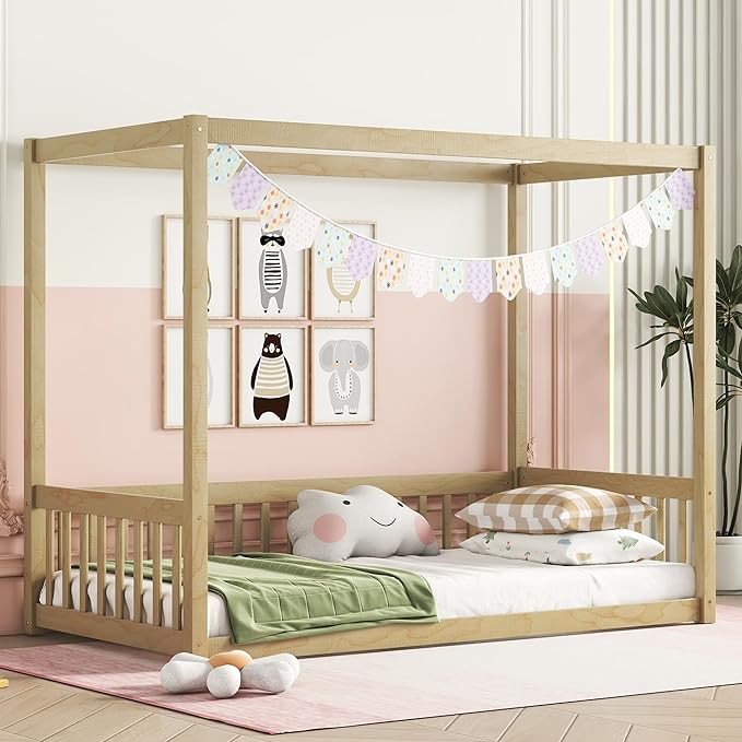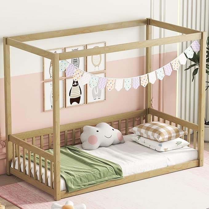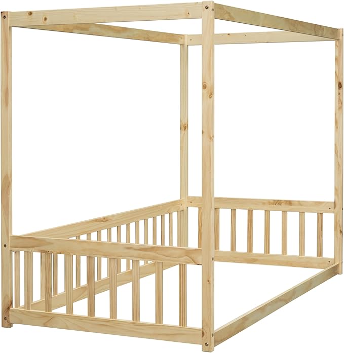 Twin Size Canopy Bed Frame with Guardrails for Kids,Floor Bed Twin with Four Poster Design,Kids Montessori Floor Bed,Wood Canopy Bed Frame for Girls,Boys(Twin,Natural)