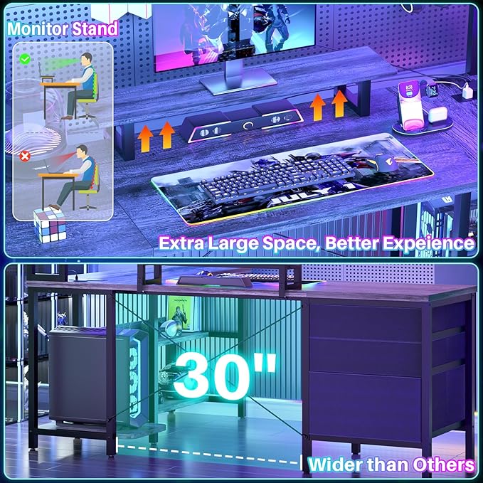 Aheaplus L Shaped Desk with Hutch, Gaming Desk with Led Lights, Reversible Computer Desk with Power Outlet, Corner Desk with File Drawer & Monitor Stand, Storage Shelves for Home Office, Black Oak