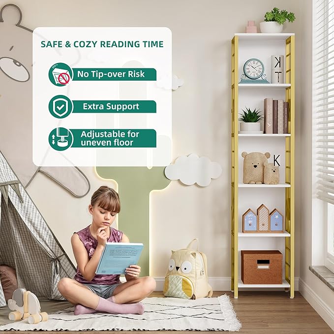 YITAHOME Narrow Bookshelf, 5-Tier White and Gold Book Shelf Storage Rack, Display Shelves Stand Etagere for Small Spaces, Open Bookcase for Bedroom Living Room Bathroom Kitchen, Gold