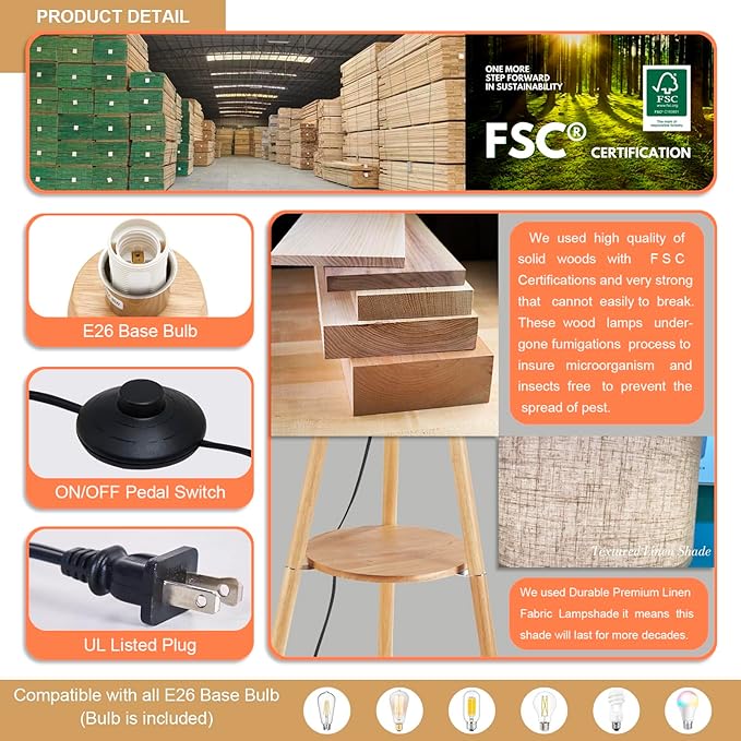 Wood Tripod Floor Lamp with Shelves,Linen Shade Modern Mid Century Wooden Standing Floor lamp for Living Room,with Three Color temparature Bulb Included,ETL Listed/Natural Wood Color