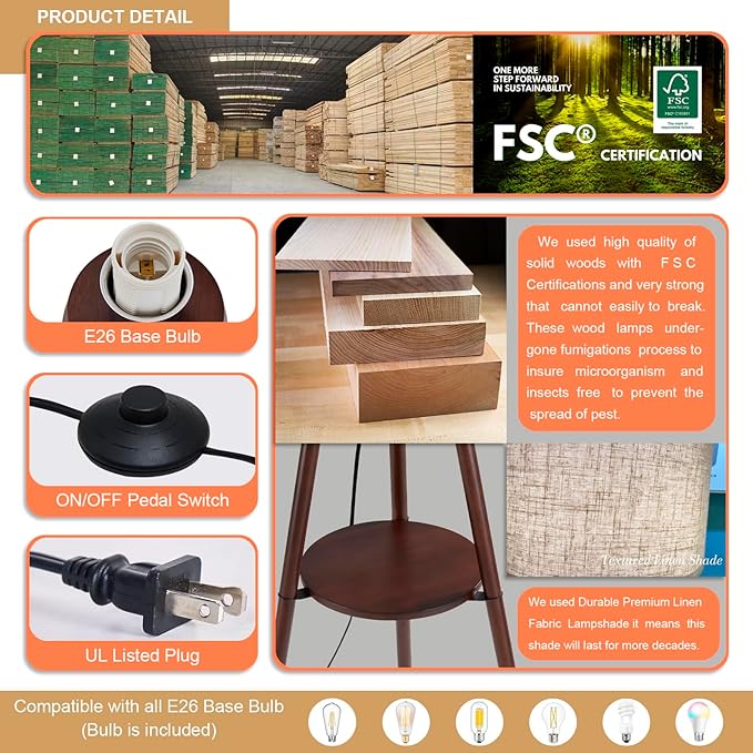 Wood Tripod Floor Lamp for Living Room,Linen Shade Mid Century Wooden Shelf Floor lamp for Bedroom,with Three Color temparature Bulb Included,ETL Listed/Dark Brown Wood Color