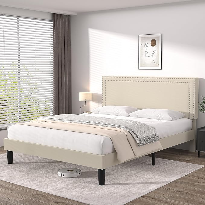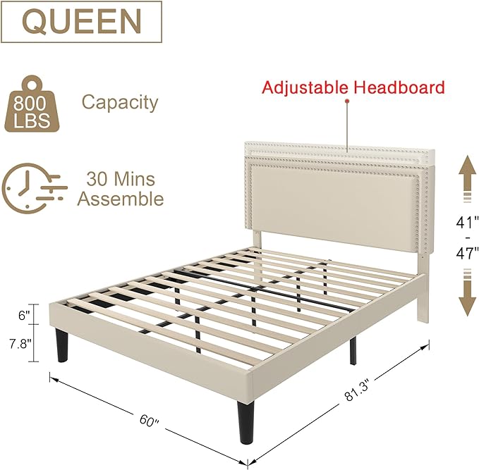VECELO Queen Size Platform Bed Frame with Height Adjustable Upholstered Headboard, Modern Mattress Foundation,Strong Wood Slat Support, No Box Spring Needed, Easy Assembly