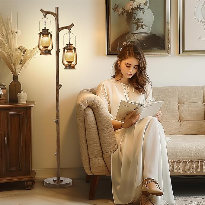 68" Rustic Farmhouse Tree Trunk Floor Lamp Country Brown Finish Wood Vintage Standing Tall Lamp with lantern Stepless Dimmable Industrial floor Lamp Decor for Bedroom Living Room Office Hotel