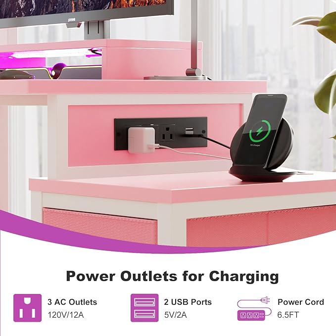 About This Small Desk with Drawers and Storage Shelves: Besiost pink gaming desk is equipped with 2 fabric drawers, multiple...