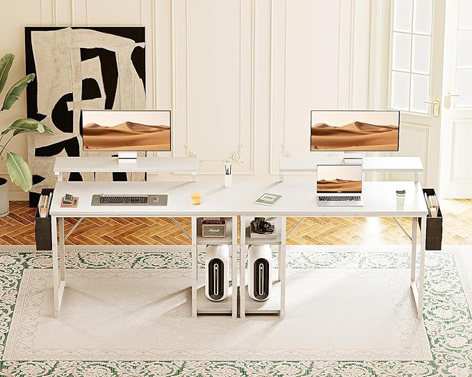 KKL 40 inch Small Computer Desk with Adjustable Monitor Stand, Home Office Desk & Workstation with Storage Shelves, Reversible Work Writing Study Table for Bedroom, White