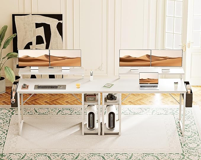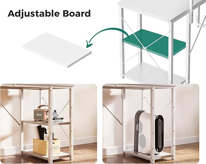 KKL 48 inch Small Computer Desk with Adjustable Monitor Stand, Home Office Desk & Workstation with Storage Shelves, Reversible Work Writing Study Table for Bedroom, White