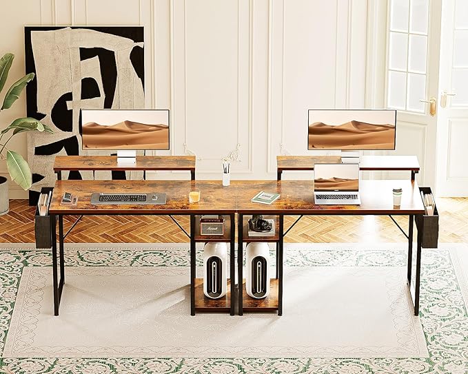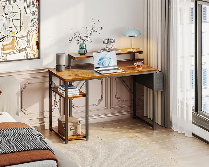KKL 40 inch Small Computer Desk with Adjustable Monitor Stand, Home Office Desk & Workstation with Storage Shelves, Reversible Work Writing Study Table for Bedroom, Rustic Brown