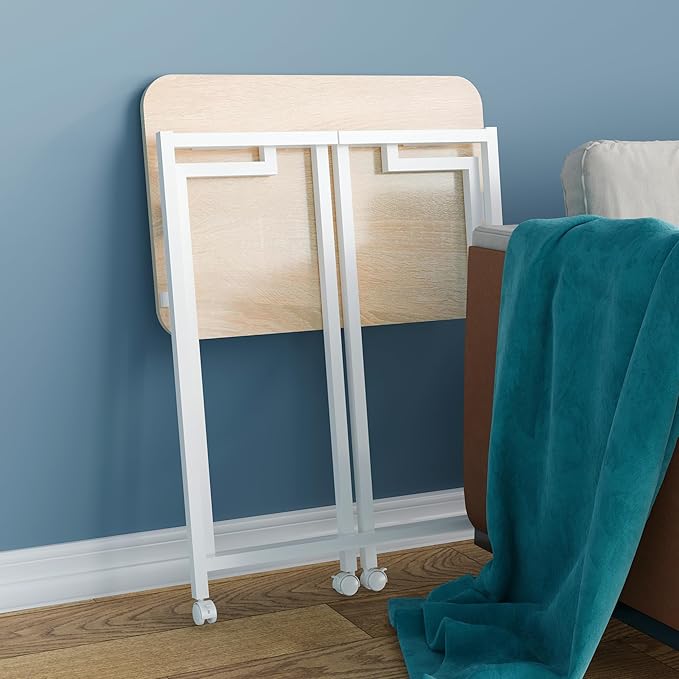 4NM 23.6" Mobile Small Folding Desk, Adjustable Rolling Compact Laptop Cart Desk, Couch Desk, Bed Desk for Laptop for Small Space Offices - Natural and White
