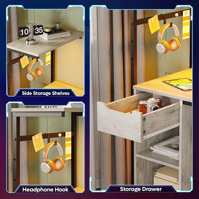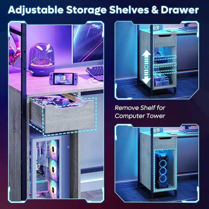 Bestier Gaming Desk with Drawer and LED Lights, 48 inch Computer Desk PC Table with Adjustable Storage Shelves & Hook for Home Office, Light Grey