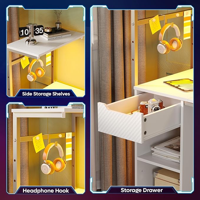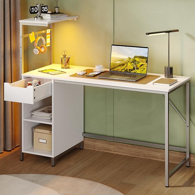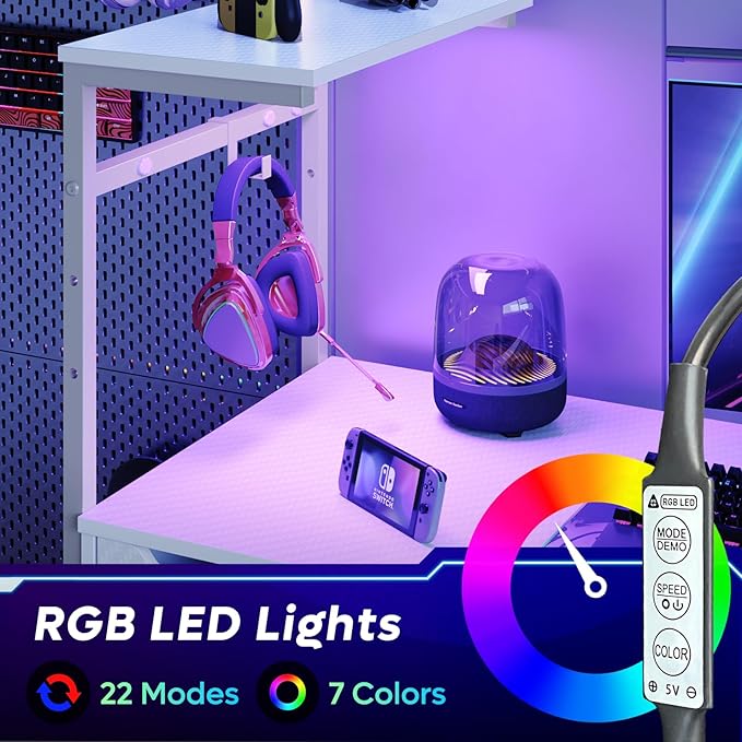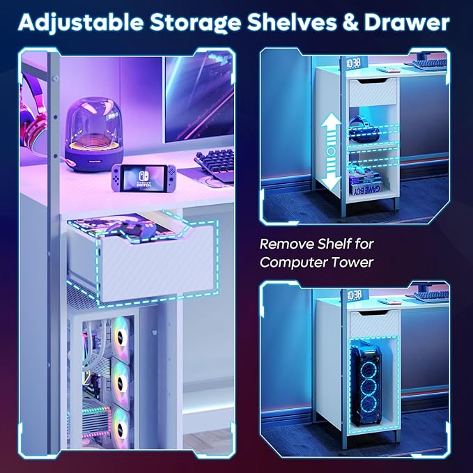 Bestier Gaming Desk with Drawer and LED Lights, 48 inch Computer Desk PC Table with Adjustable Storage Shelves & Hook for Home Office, Carbon Fiber White