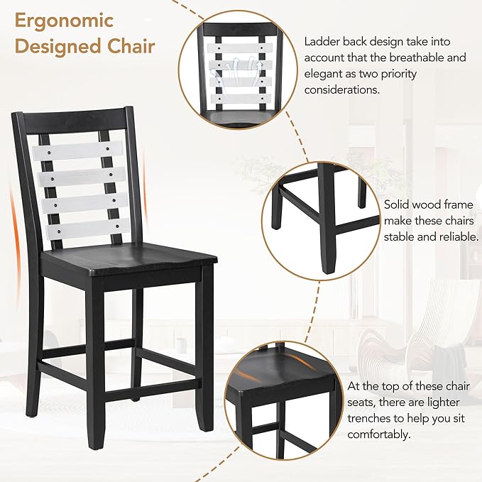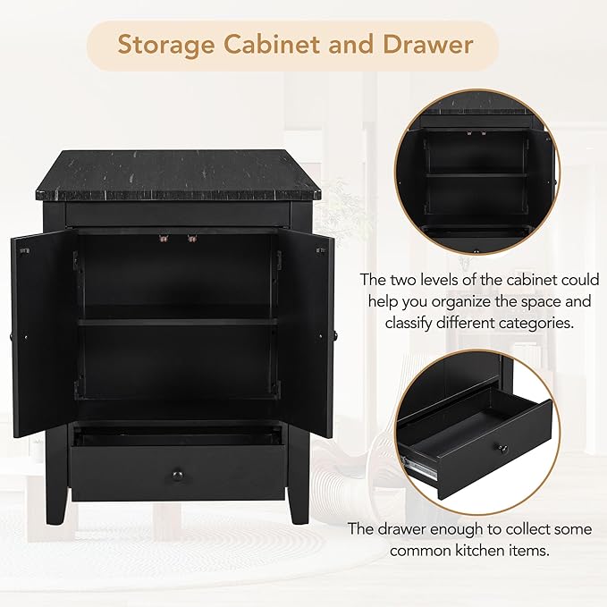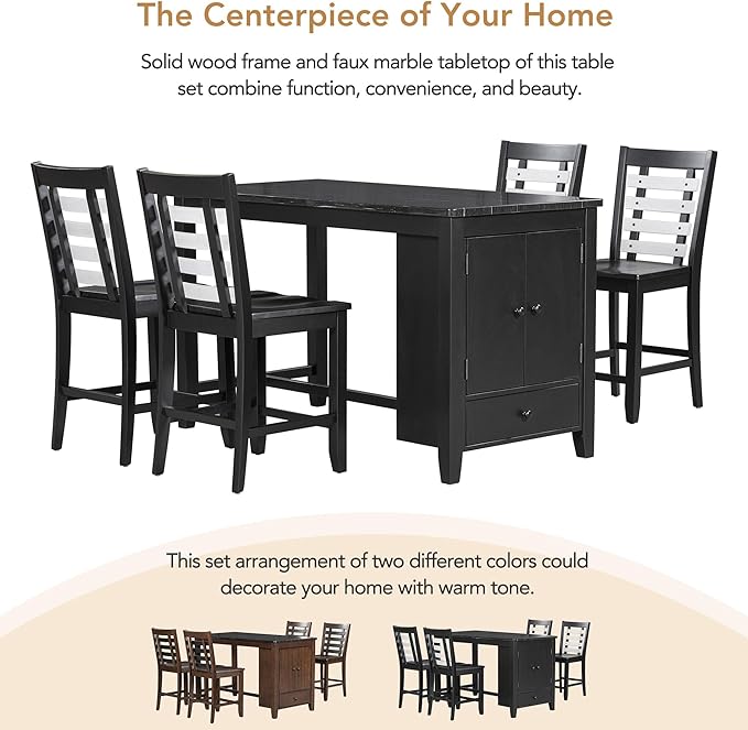 Rustic Style Counter Height Faux Marble Tabletop, Solid Wood Storage Cabinet and Drawer, Room, Kitchen, Black, 5 Piece Dining Table Set