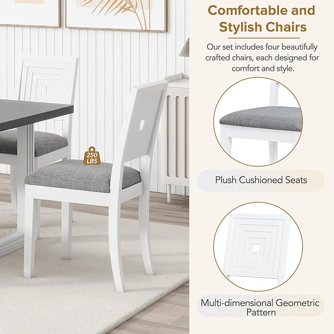 Modern Extendable 4 Upholstered Chairs Bench, Rubber Wood w/18 Butterfly Leaf, Room, Kitchen, Small Place, White+Gray, 6 Piece Dining Table Set