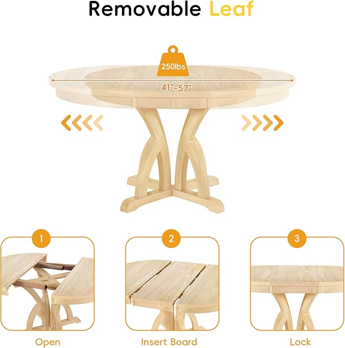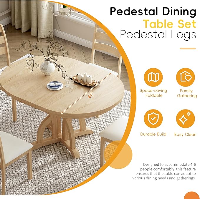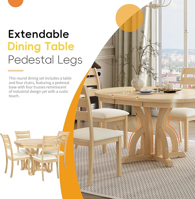 Farmhouse Round Pedestal 15.8" Removable Leaf, Extendable Kitchen w/Ladder Back Chairs, for Small Places, Room, 5 Piece Dining Table Set, Natural 16
