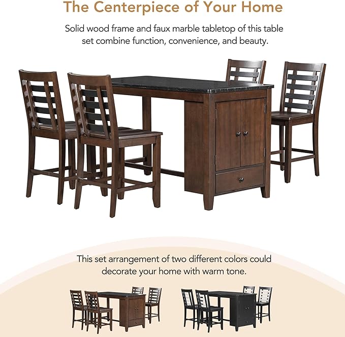 Rustic Style Counter Height Faux Marble Tabletop, Solid Wood Storage Cabinet and Drawer, Room, Kitchen, 5 Piece Dining Table Set, Walnut 28