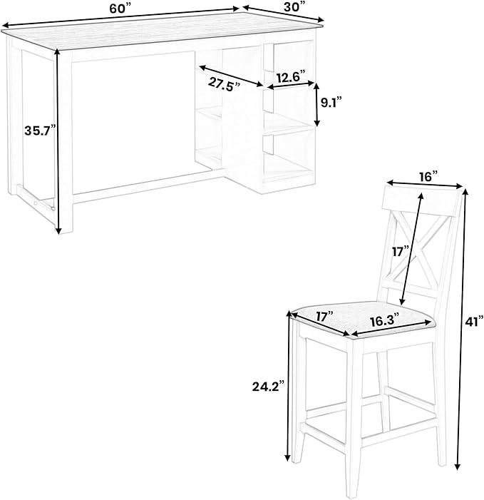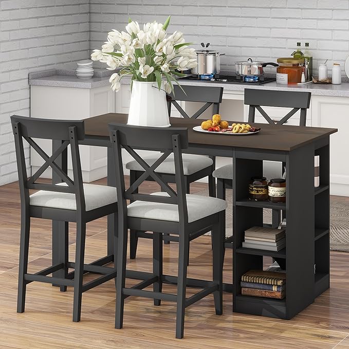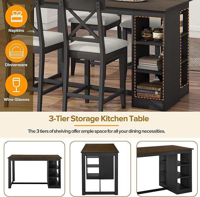 Farmhouse Counter Height 3-Tier Storage Shelves, Solid Wood w/4 Upholstered Chairs, Easy Assembly, for Kitchen, Room, 5 Piece Dining Table Set, Gray 12