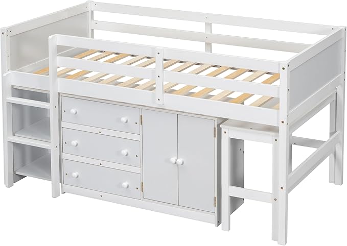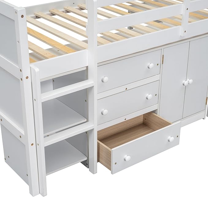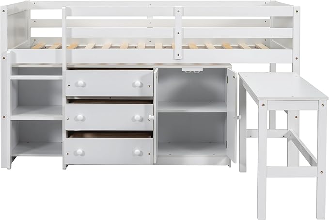 Twin Size Low Loft Bed with Pull-Out Desk, Drawers, Cabinet, and Shelves, for Kids Boys Girls Bedroom, White