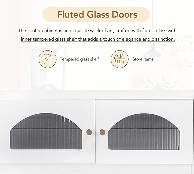 Luxurious Long Fluted Doors, Tempered Glass Shelf Entertainment Center Media Console Table Stand for TVs Up to 95'', with Multiple Storage for Living Room, Bedroom, White