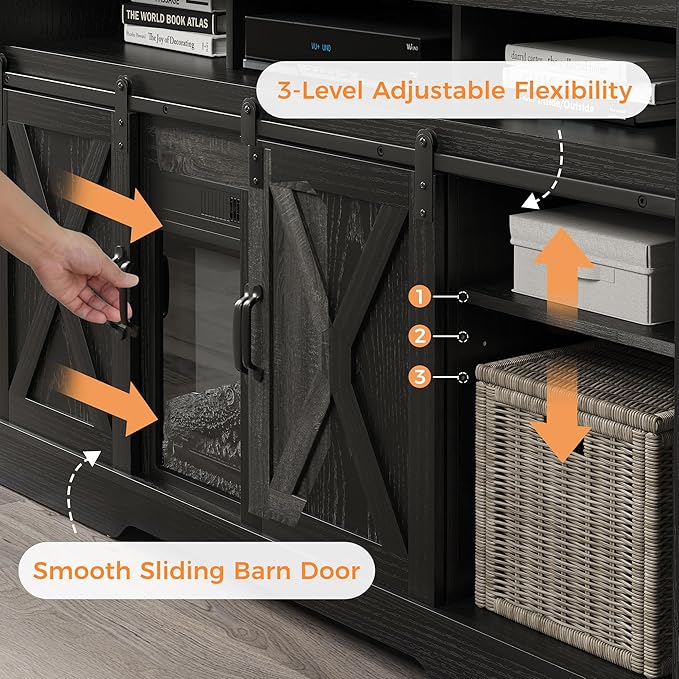 Farmhouse TV Stand for 23" Fireplace, 34'' Tall Entertainment Center for 65+ Inch TV, Rustic TV Console with Sliding Bar Door for Living Room (Black)