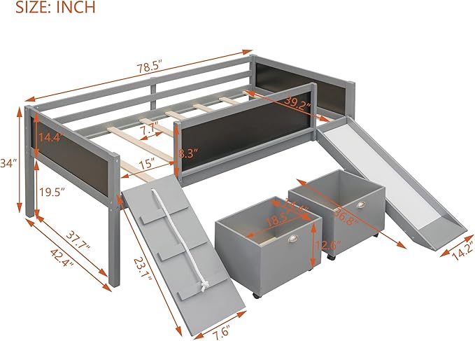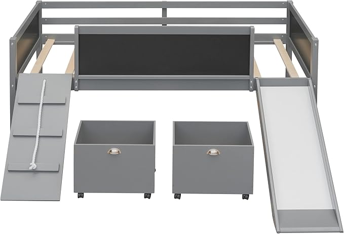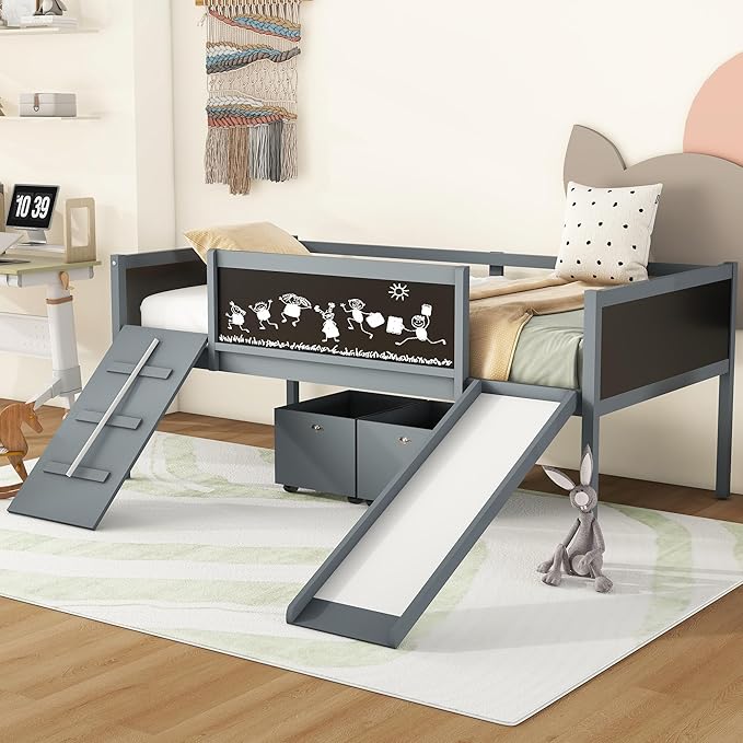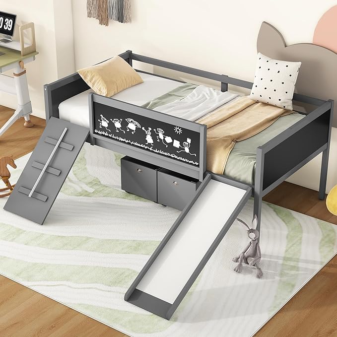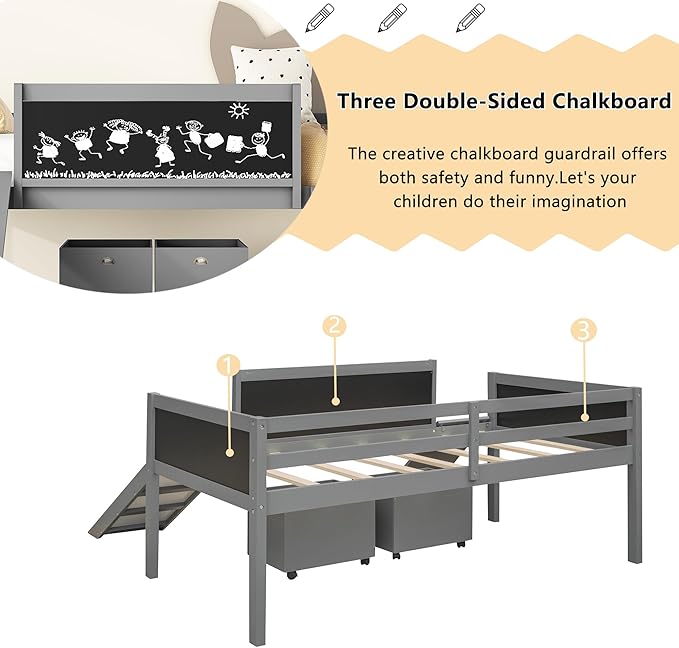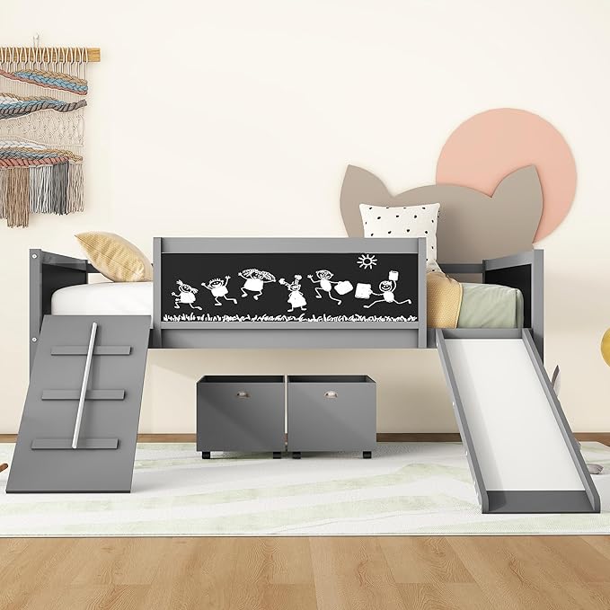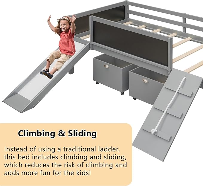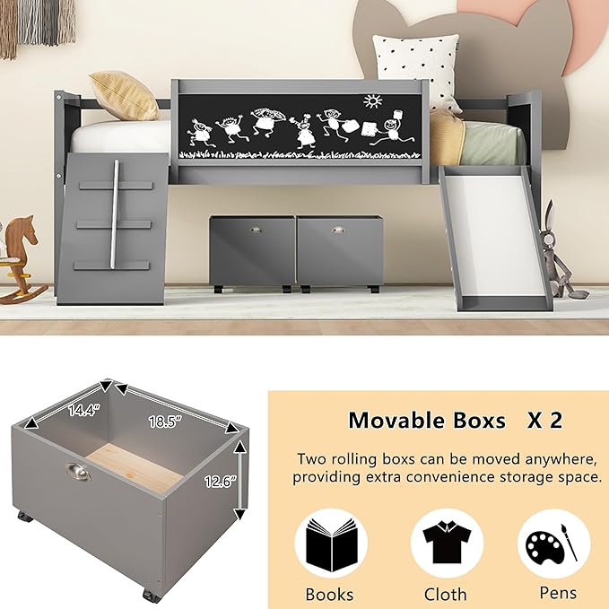 Twin Size Low Loft Bed with Slide and 2 Storage Boxes,Kids Low Loft Bed Frame with Climbing and Chalkboard,Solid Loft Bed Twin for Boys,Girls,Gray