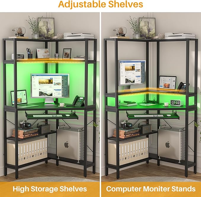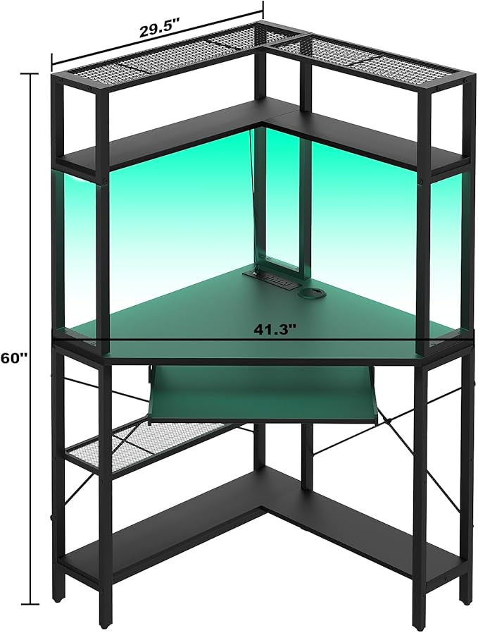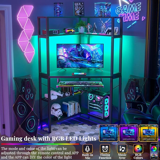 Cyclysio Small Corner Desk with Hutch, Corner Gaming Desk with LED Light & Power Outlets, Computer Desk with Keyboard Tray, Triangel Desk for Small Space, Home Office, Workstation, Black