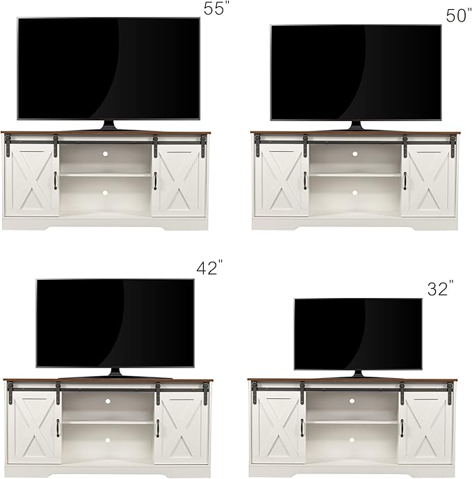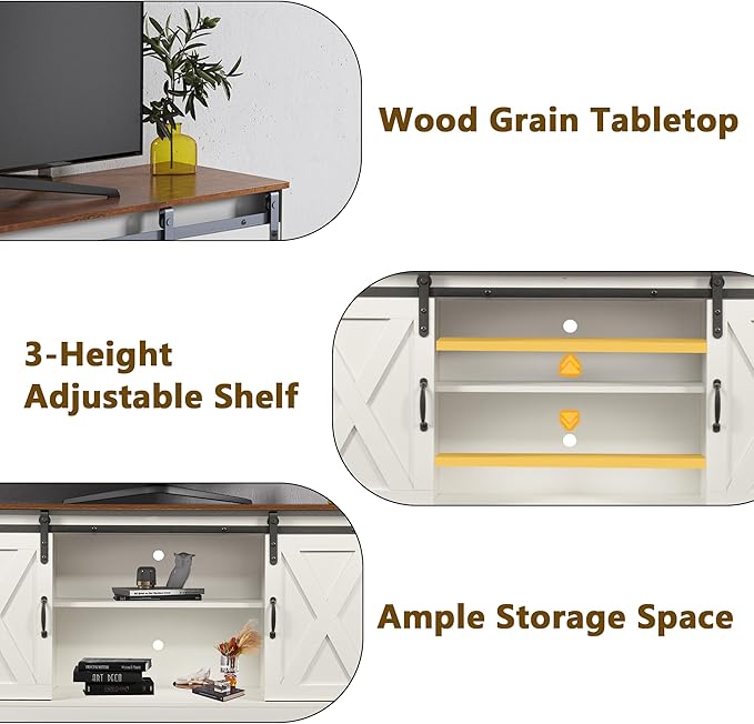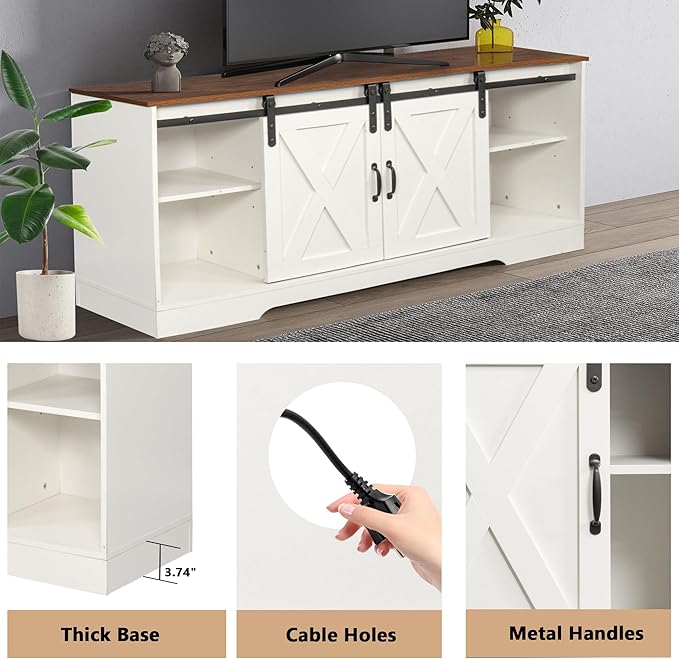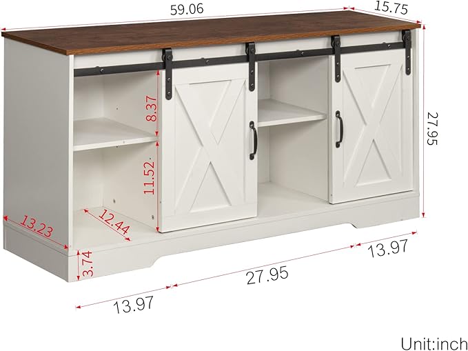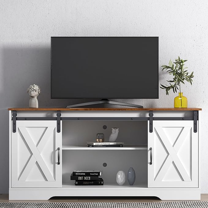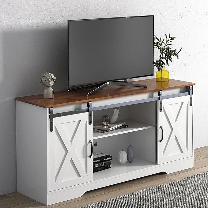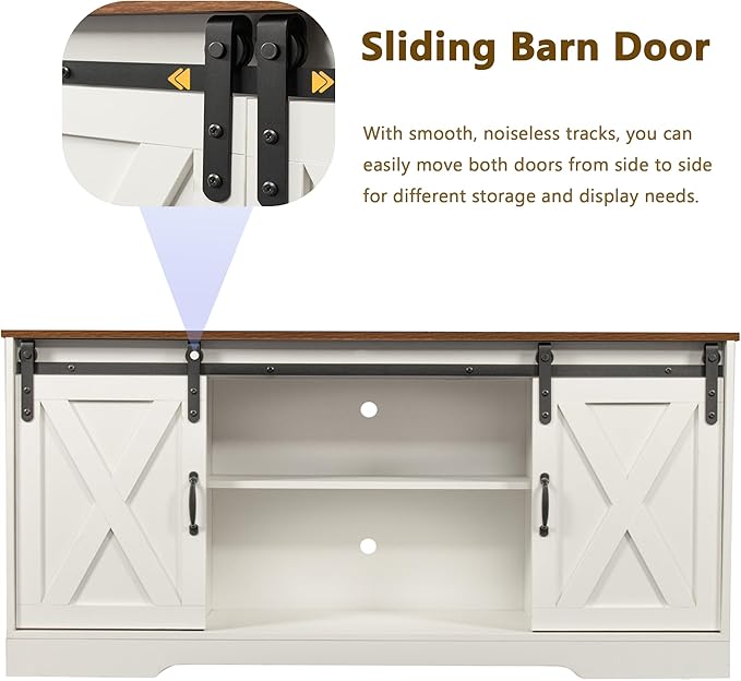 TV Stand with 2 Sliding Barn Doors, 59 Inch Television Stands with Adjustable Shelves for TVs Up to 65", Entertainment Center with Storage for Living Room, Distressed White