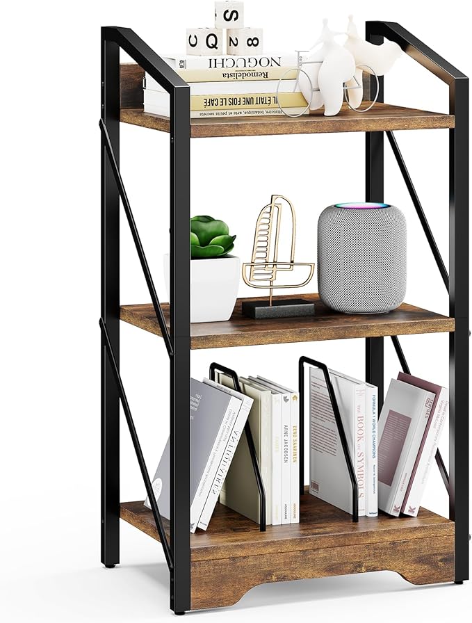 Vagusicc 3 Tier Bookshelf, Small Book Shelf Industrial Bookshelf, Wood Short Book Shelf Office Shelves with Metal Frame, Rustic Open Shelf Storage Organizer Bookcase for Living Room Bedroom, Brown