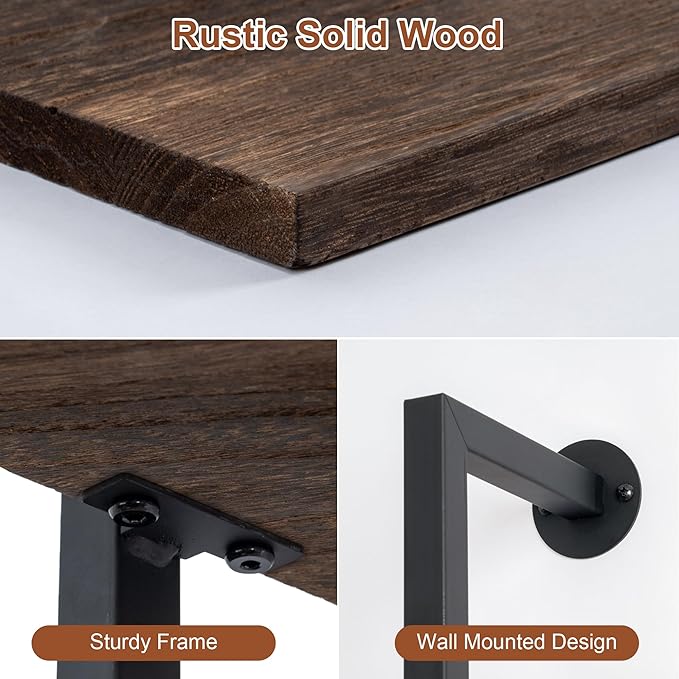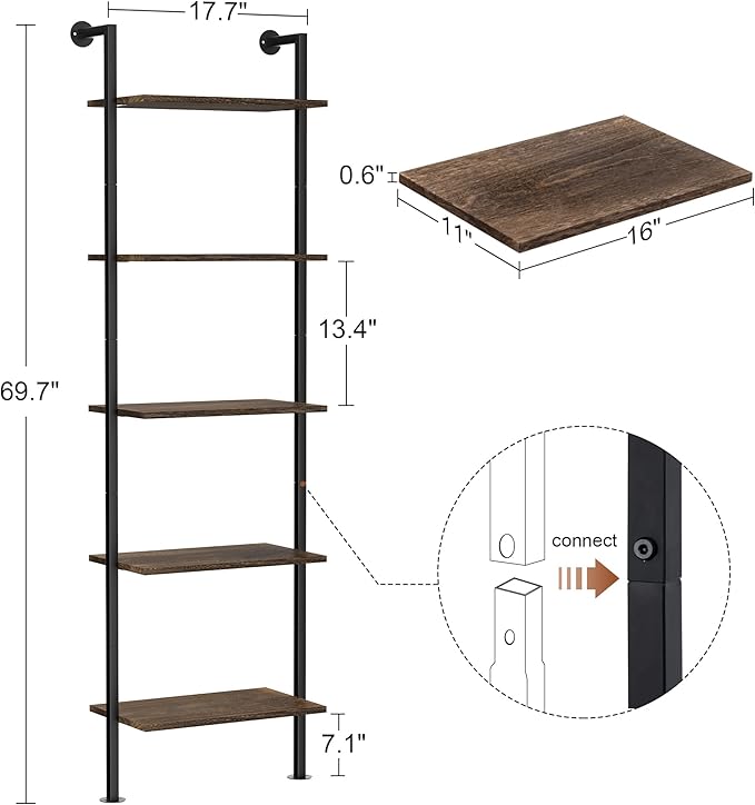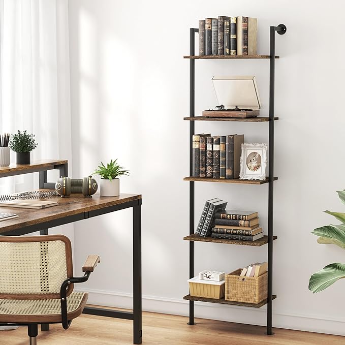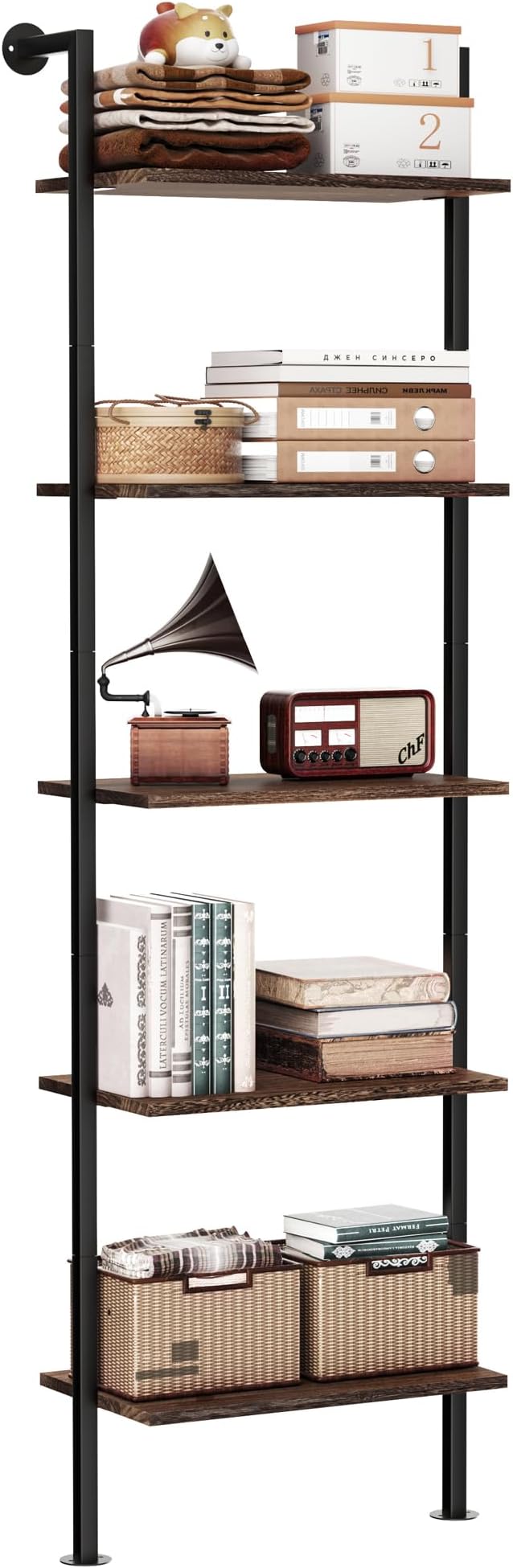 5-Tier Bookshelf Solid Wood Ladder Shelf, Narrow Book shelf Display Shelf, Wooden Ladder Shelf Bookcase, Wall Mount Ladder Shelf, Storage Rack for Living Room, Bedroom, Industrial Style, Dark Brown